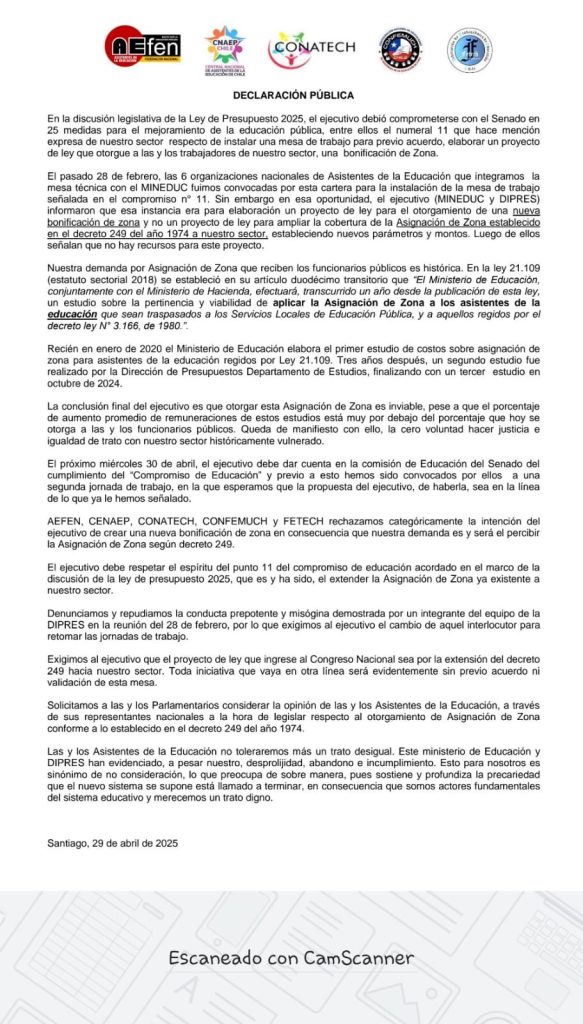 La demanda de nuestro sector siempre ha sido el percibir la Asignación de Zona contemplado en el decreto 249 del año 1974, beneficio que reciben todos los funcionarios públicos. En esa línea, logramos que en nuestro estatuto, ley 21.109, publicado en el diario oficial el 2 de octubre de 2018, se comprometiera en el artículo duodécimo transitorio la clausula “El Ministerio de Educación, conjuntamente con el Ministerio de Hacienda, efectuará, transcurrido un año desde la publicación de esta ley, un estudio sobre la pertinencia y viabilidad de aplicar la Asignación de Zona a los asistentes de la educación que sean traspasados a los Servicios Locales de Educación Pública, y a aquellos regidos por el decreto ley N° 3.166, de 1980.”.