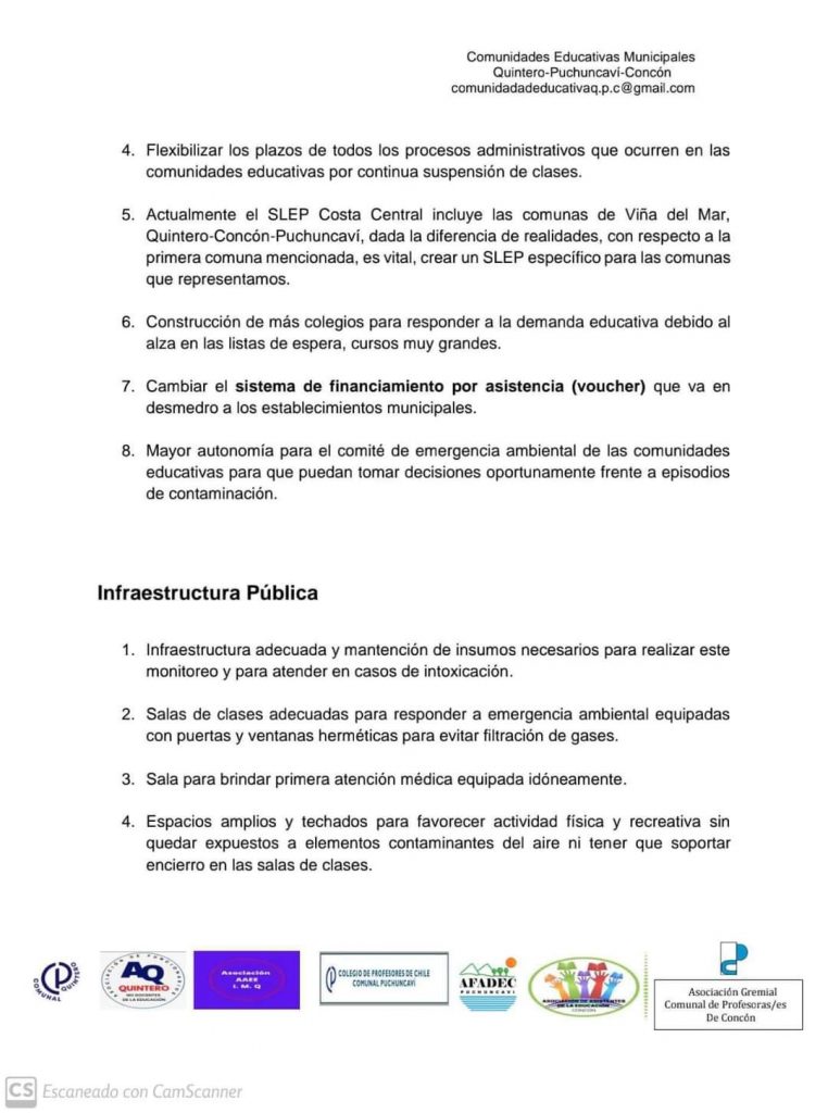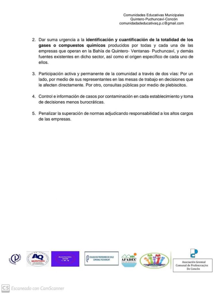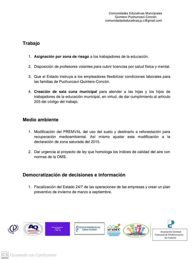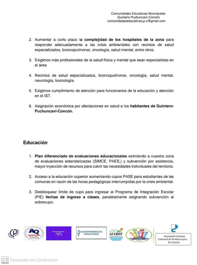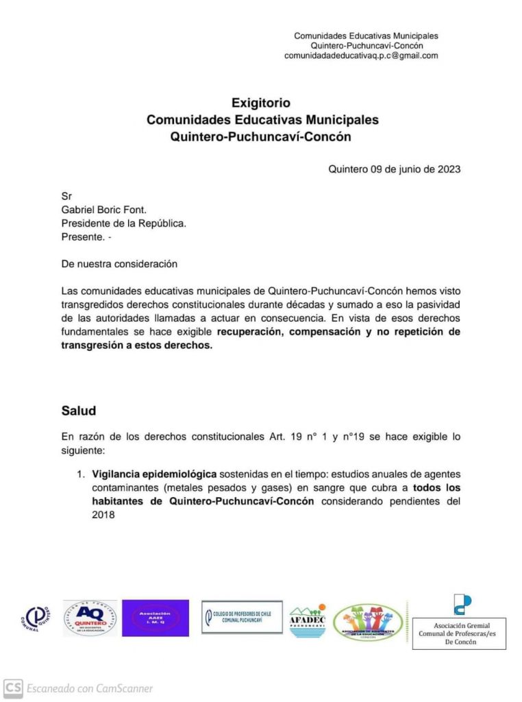 Este viernes 9 de junio de 2023, representantes de los diversos actores de la comunidad educativa de la comuna de Quintero, se reunieron con los ministros Álvaro Elizalde de la Secretaria General de la Presidencia, Maida Rojas de Medio Ambiente y Marco Antonio Ávila de Educación, además del senador Juan Ignacio Latorre, el diputado Diego Ibáñez, la asesora de la Diputada Carolina Marsan y la delegada presidencial de Valparaíso Sofía González, a quienes exigieron implementar medidas urgentes y concretas con que enfrentar la crisis medioambiental que el territorio, luego de exponer cada uno de los puntos del exigitorio.