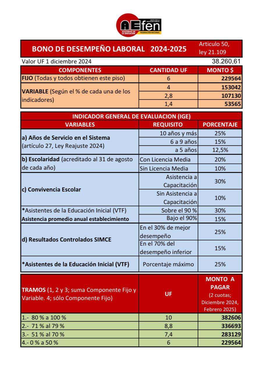 Compartimos con Ustedes, la Tabla del Bono de Desempeño Laboral 2024-2025, según lo establecido en el artículo 50 de la ley 21.109 y en esta ocación la variable «Años de Antiguedad en el Servicio» según el artículo 27 de la ley de reajuste del sector público año 2024-2025.
